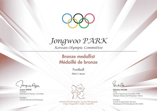 파주 NFC에서 금일 오후 공개될 예정인 증명서에는 박종우의 이름과 함께 남자축구 동메달리스트라는 문구가 쓰여있고, 하단에는 자크 로게 IOC 위원장의 사인이 인쇄돼 있다.