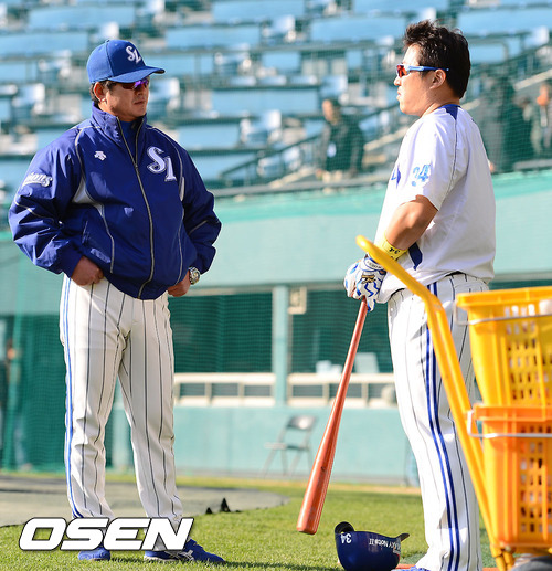 31일 오후 서울 잠실구장에서 열린 '2012 팔도 프로야구' 삼성 라이온즈와 SK 와이번스의 한국시리즈 5차전, 경기에 앞서 삼성 류중일 감독이 최형우와 이야기를 나누고 있다.
