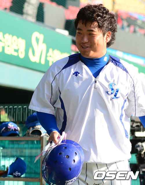 31일 오후 서울 잠실구장에서 열린 2012 팔도 프로야구 한국시리즈 5차전, 경기에 앞서 삼성 박석민이 그라운드에 들어서며 기자들의 관심에 쑥스러운 미소를 짓고 있다.