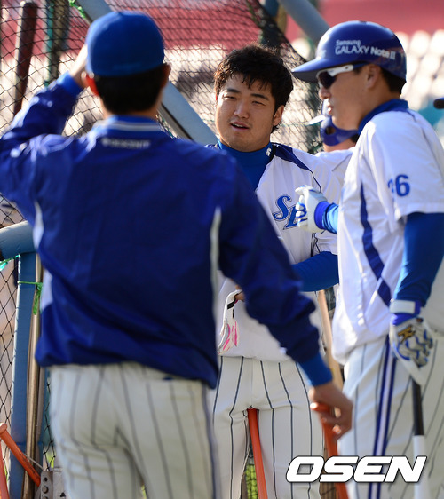 31일 오후 서울 잠실구장에서 열린 2012 팔도 프로야구 한국시리즈 5차전, 경기에 앞서 삼성 박석민과 이승엽이 훈련을 하며 주먹을 맞대고 있다. 박석민은 한국시리즈 8푼3리 심각한 부진에 빠져 있다.