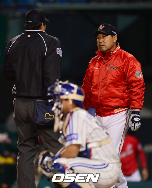 31일 오후 서울 잠실구장에서 열리는 '2012 팔도 프로야구' 삼성 라이온즈와 SK 와이번스의 한국시리즈 5차전 경기, 1회초 1사 박재상의 아웃때 이만수 감독이 문승훈 구심에게 어필을 하고 있다.