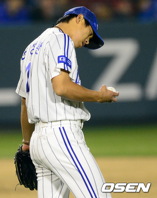 31일 오후 서울 잠실구장에서 열린 2012 팔도 프로야구 한국시리즈 5차전, 1회초 2사에서 삼성 윤성환이 SK 최정에 안타를 허용하고 아쉬워하고 있다.
