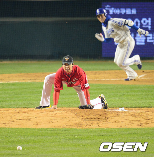 31일 오후 서울 잠실구장에서 열린 '2012 팔도 프로야구' 삼성 라이온즈와 SK 와이번스의 한국시리즈 5차전 경기 3회말 2사 1루 배영섭의 땅볼 타구를 윤희상이 바라보고 있다.