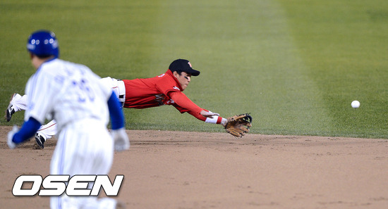 31일 오후 서울 잠실구장에서 열린 '2012 팔도 프로야구' 삼성 라이온즈와 SK 와이번스의 한국시리즈 5차전, 3회말 1사 1루 삼성 최형우의 타구를 SK 정근우 2루수가 다이빙캐치 시도하고 있다