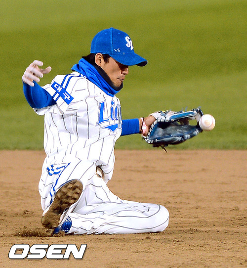 31일 오후 서울 잠실구장에서 열린 '2012 팔도 프로야구' 삼성 라이온즈와 SK 와이번스의 한국시리즈 5차전, 4회초 무사 1루 삼성 김상수 유격수가 SK 최정의 내야안타 타구를 놓치고 있다.