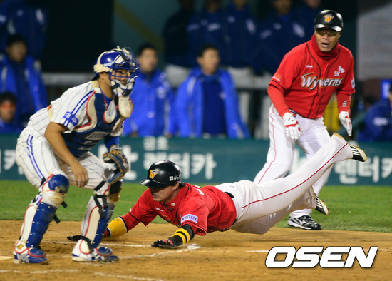31일 오후 서울 잠실구장에서 열린 2012 팔도 프로야구 한국시리즈 5차전, 4회초 무사 1,2루에서 SK 박재상이 이호준의 1타점 적시타에 홈에서 슬라이딩하고 있다.