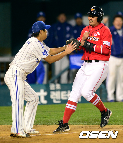 31일 오후 서울 잠실구장에서 열린 2012 팔도 프로야구 한국시리즈 5차전, 4회초 2사 1,3루에서 더블스틸 작전에 협살에 걸린 SK 이호준이 삼성 윤성환에 태그아웃 당하고 있다.