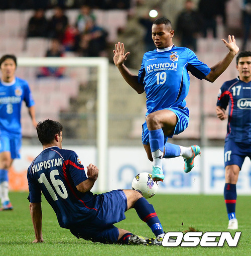 31일 오후 울산 문수축구경기장에서 열린 '2012 AFC 챔피언스리그 준결승 2차전' 울산 현대와 부뇨드코르(우즈베키스탄)의 경기, 전반 울산 하피냐가 부뇨드코르 수비진의 태클에 걸리고 있다.