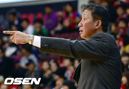 31일 오후 안양실내체육관에서 열린 'KB 국민카드 2012-2013 프로농구' 안양 KGC와 전주 KCC의 경기 4쿼터 KCC 허재 감독이 선수들에게 작전지시를 하고 있다.