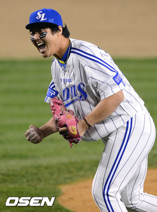 31일 오후 서울 잠실구장에서 열린 '2012 팔도 프로야구' 삼성 라이온즈와 SK 와이번스의 한국시리즈 5차전, 7회초 무사 1,2루 위기를 넘긴 삼성 안지만 투수가 주먹을 쥐며 환호하고 있다