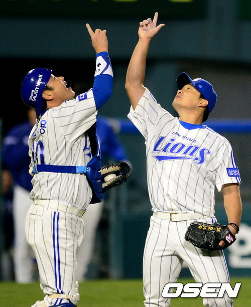 9회초 2사 1,3루에서 삼성 오승환이 SK 박진만을 삼진으로 처리하고 진갑용과 승리 세리머니를 하고 있다./jpnews@osen.co.kr