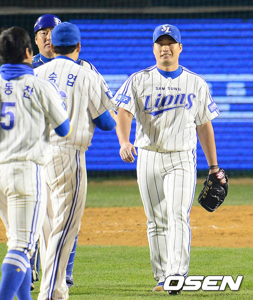 31일 오후 서울 잠실구장에서 열린 '2012 팔도 프로야구' 삼성 라이온즈와 SK 와이번스의 한국시리즈 5차전 경기 종료 후 오승환이 미소를 지으며 동료들과 하이파이브를 하고 있다.