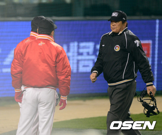 9회초 2사 3루에서 SK 박진만이 삼진을 당하자 이만수 감독이 그라운드로 나와 문승훈 구심에 불만을 나타내고 있다./jpnews@osen.co.kr