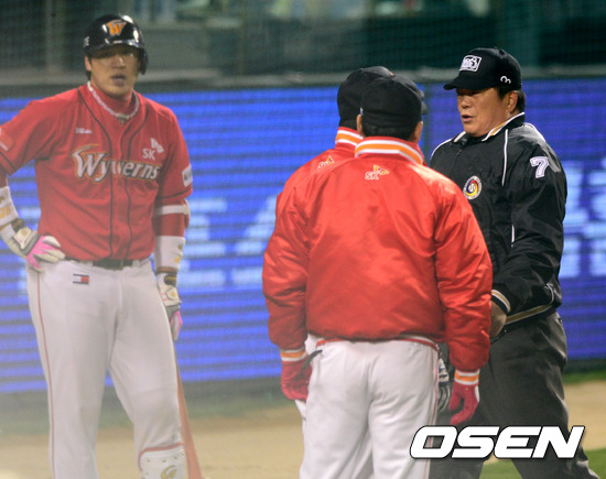 9회초 2사 3루에서 SK 박진만이 삼진을 당하자 이만수 감독이 그라운드로 나와 문승훈 구심에 불만을 나타내고 있다./jpnews@osen.co.kr