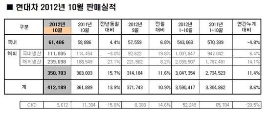 현대차는 올해 1월부터 10월까지 국내·외시장에서 작년 동기대비 8.6% 증가한 총 359만 417대를 판매했으며 이 중 54만 63대는 국내판매로 4.8% 감소했으나 해외판매는 304만 7354대로 작년보다 11.4% 증가했다.