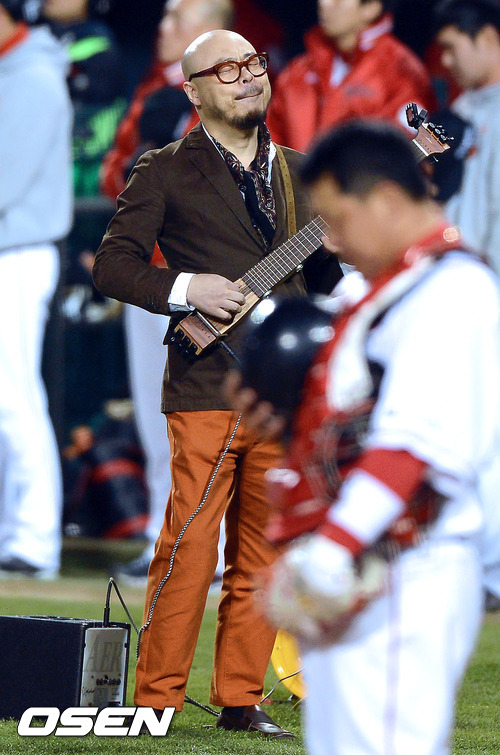 1일 오후 서울 잠실구장에서 열린 '2012 팔도 프로야구' 삼성 라이온즈와 SK 와이번스의 한국시리즈 6차전 경기에 앞서 기타리스트 이병우가 애국가 연주를 하고 있다.