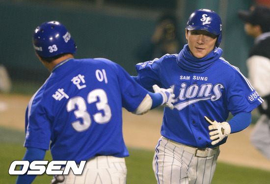 1일 오후 서울 잠실구장에서 열린 '2012 팔도 프로야구' 삼성 라이온즈와 SK 와이번스의 한국시리즈 6차전 1회초 1사 2,3루 삼성 최형우의 희생플라이때 3루 주자 배영섭이 홈을 밟은 후 박한이와 하이파이브를 하고 있다