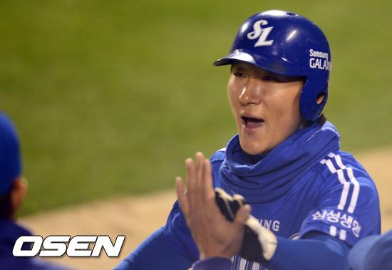 1일 오후 서울 잠실구장에서 열린 '2012 팔도 프로야구' 삼성 라이온즈와 SK 와이번스의 한국시리즈 6차전 1회초 1사 2,3루 삼성 최형우의 희생플라이때 3루 주자 배영섭이 홈을 밟은 후 동료들의 축하를 받고 있다