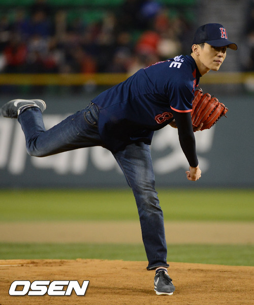 1일 오후 서울 잠실구장에서 열린 '2012 팔도 프로야구' 삼성 라이온즈와 SK 와이번스의 한국시리즈 6차전 경기에 앞서 배우 이동욱이 시구를 하고 있다