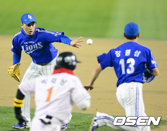 1일 오후 서울 잠실구장에서 열린 '2012 팔도 프로야구' 삼성 라이온즈와 SK 와이번스의 한국시리즈 6차전 경기, 1회말 1사 박재상 내야땅볼때 삼성 이승엽이 포구하며 장원삼에게 토스 송구를 하여 아웃처리 시키고 있다.