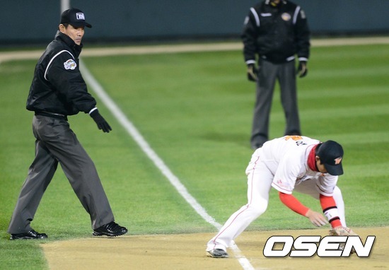 1일 오후 서울 잠실구장에서 열린 '2012 팔도 프로야구' 삼성 라이온즈와 SK 와이번스의 한국시리즈 6차전 경기, 2회초 2사 진갑용 3루선상 타구를 SK 최정 3루수가 포구하며 아웃처리 시키고 있다.