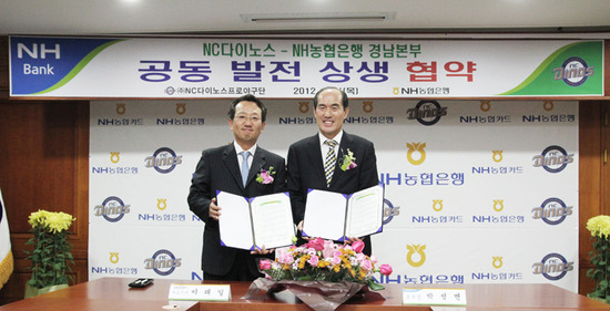NC 다이노스와 NH농협은행 경남본부는 1일 농협은행 경남본부에서 공동발전을 위한 상생 협약을 체결했다. 이날 행사는 NC 다이노스 이태일 대표이사, 농협은행 경남본부 박성면 본부장이 참석한 가운데 진행됐다.