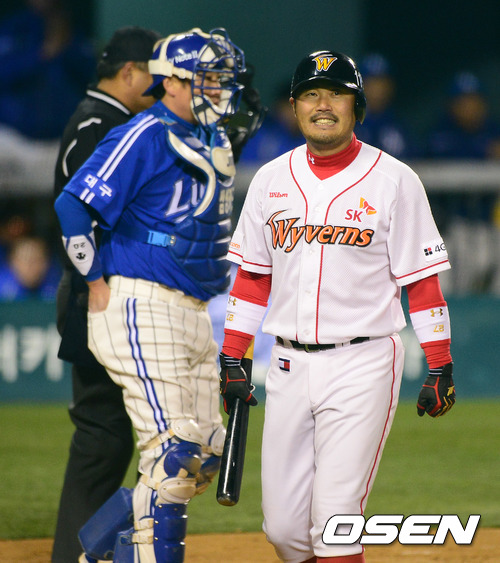 1일 오후 서울 잠실구장에서 열린 '2012 팔도 프로야구' 삼성 라이온즈와 SK 와이번스의 한국시리즈 6차전, 2회말 1사에서 SK 이호준이 삼진을 당하고 아쉬워하고 있다.