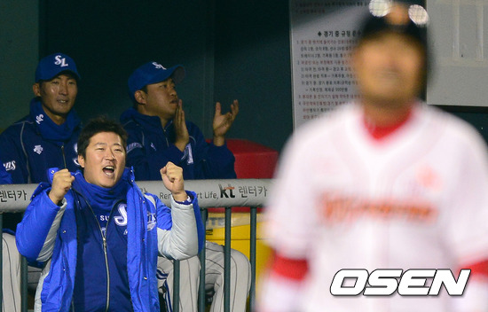 1일 오후 서울 잠실구장에서 열린 '2012 팔도 프로야구' 삼성 라이온즈와 SK 와이번스의 한국시리즈 6차전, 2회말 1사에서 SK 이호준이 삼진을 당하자 삼성 최형우가 기뻐하고 있다.