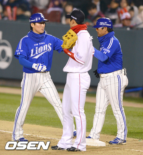 1일 오후 서울 잠실구장에서 열린 '2012 팔도 프로야구' 삼성 라이온즈와 SK 와이번스의 한국시리즈 6차전 3회초 1사 삼성 배영섭이 안타를 날린 후 김태균 코치와하이파이브를 하고 있다.