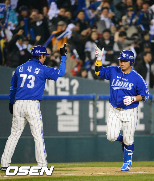 1일 오후 서울 잠실구장에서 열린 '2012 팔도 프로야구' 삼성 라이온즈와 SK 와이번스의 한국시리즈 6차전, 4회초 1사 주자 1루 삼성 박석민이 좌월 투런홈런을 날린 후 그라운드를 돌며 기뻐하고 있다.