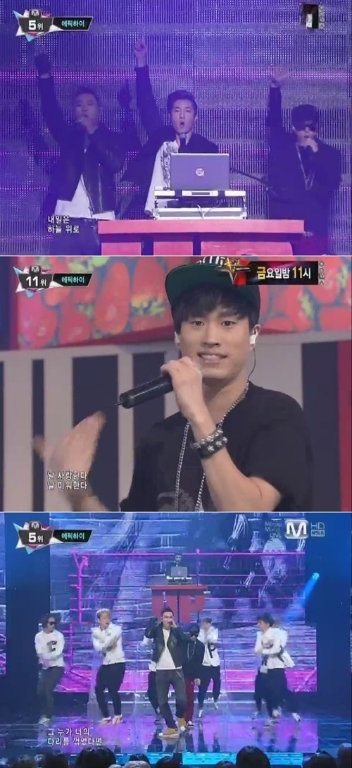 이번주 '엠카' 종합순위 5위를 차지한 '업(UP)'으로 먼저 무대에 오른 에픽하이는 검정색과 빨간색으로 색깔을 맞춘 세트와 의상으로 등장했다. 'U'자와 'P'자가 적힌 하얀 셔츠를 입은 댄서들과의 퍼포먼스가 가사의 메시지를 독특한 방법으로 전달해 눈길을 끌었다.
