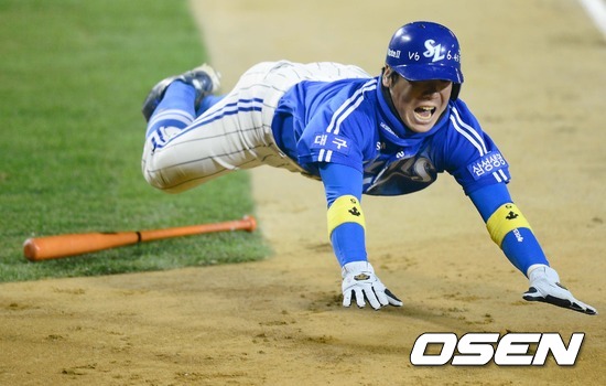 1일 오후 서울 잠실구장에서 열린 '2012 팔도 프로야구' 삼성 라이온즈와 SK 와이번스의 한국시리즈 6차전 경기, 4회말 2사 1,2루 배영섭 중견수앞 안타때 2루 주자 조동찬 홈까지 쇄도 득점을 올리고 있다.
