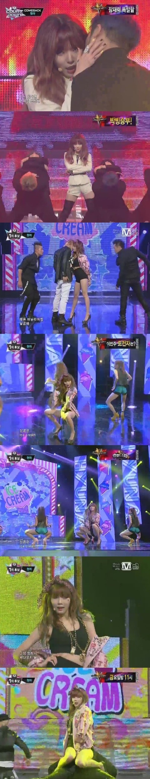 현아는 1일 오후 6시 생방송된 엠넷 '엠카운트다운'에 출연해 곡 '흐트러지지마'와 타이틀 곡 '아이스크림'을 열창했다.