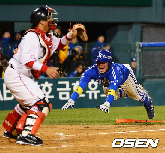 1일 오후 서울 잠실구장에서 열린 '2012 팔도 프로야구' 삼성 라이온즈와 SK 와이번스의 한국시리즈 6차전, 4회초 2사 주자 1,2루 삼성 배영섭의 중견수 앞 1타점 적시타때 2루 주자 조동찬이 홈으로 몸을 날리며 세이프되고 있다.
