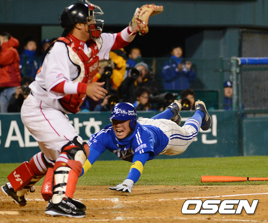 1일 오후 서울 잠실구장에서 열린 '2012 팔도 프로야구' 삼성 라이온즈와 SK 와이번스의 한국시리즈 6차전, 4회초 2사 주자 1,2루 삼성 배영섭의 중견수 앞 1타점 적시타때 2루 주자 조동찬이 홈으로 몸을 날리며 세이프되고 있다.