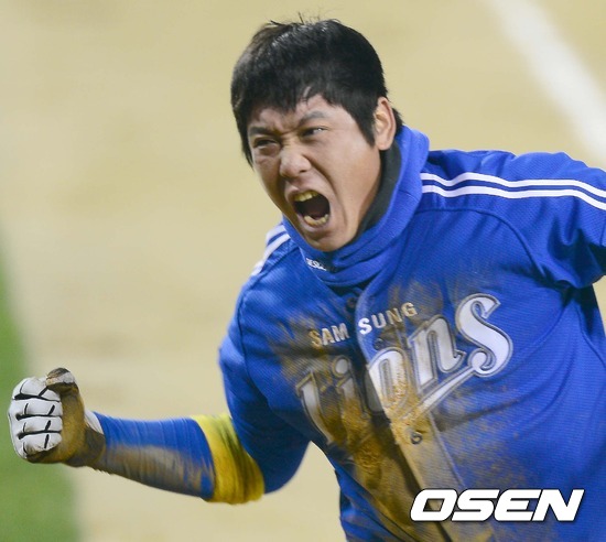 1일 오후 서울 잠실구장에서 열린 '2012 팔도 프로야구' 삼성 라이온즈와 SK 와이번스의 한국시리즈 6차전 경기, 4회말 2사 1,2루 배영섭 중견수앞 안타때 2루 주자 조동찬 홈까지 쇄도 득점을 올리며 환호하고 있다.
