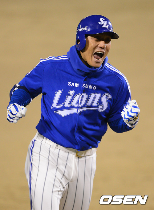 1일 오후 서울 잠실구장에서 열린 '2012 팔도 프로야구' 삼성 라이온즈와 SK 와이번스의 한국시리즈 6차전 4회초 2사 만루 삼성 이승엽이 주자일수 3타점 적시타를 날린 후 환호하고 있다