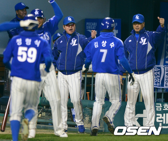 1일 오후 서울 잠실구장에서 열린 '2012 팔도 프로야구' 삼성 라이온즈와 SK 와이번스의 한국시리즈 6차전, 4회초 2사 만루에서 삼성 이승엽이 싹쓸이 3타점 적시 3루타를 날리자 류중일 감독이 기뻐하고 있다.