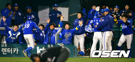 1일 오후 서울 잠실구장에서 열린 '2012 팔도 프로야구' 삼성 라이온즈와 SK 와이번스의 한국시리즈 6차전, 4회초 2사 만루에서 삼성 이승엽이 싹쓸이 3타점 적시 3루타를 날리자 더그아웃의 동료선수들이 열광하고 있다.