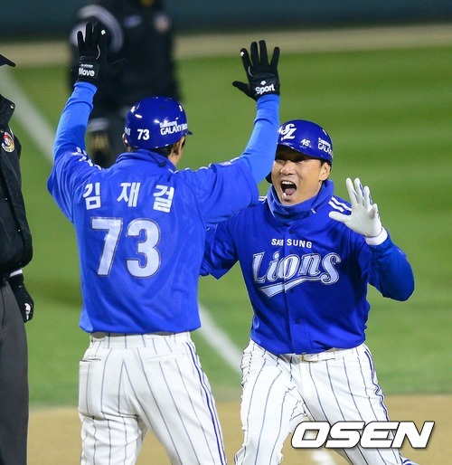 1일 오후 서울 잠실구장에서 열린 '2012 팔도 프로야구' 삼성 라이온즈와 SK 와이번스의 한국시리즈 6차전 경기, 4회말 2사 만루 이승엽 싹슬이 안타를 날리고 3루에서 김재걸 코치의 환영을 받고 있다.