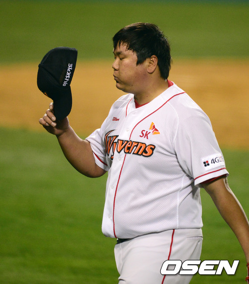 1일 오후 서울 잠실구장에서 열린 '2012 팔도 프로야구' 삼성 라이온즈와 SK 와이번스의 한국시리즈 6차전, 4회초 2사 3루에서 SK 채병용이 삼성 최형우를 삼진으로 처리하고 더그아웃으로 향하며 한숨을 쉬고 있다.