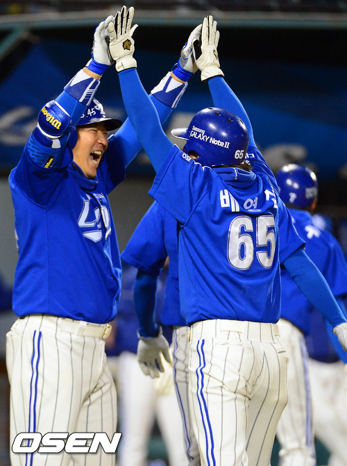 1일 오후 서울 잠실구장에서 열린 '2012 팔도 프로야구' 삼성 라이온즈와 SK 와이번스의 한국시리즈 6차전 경기, 4회말 2사 만루 이승엽이 싹쓸이 안타를 날렸을때 홈을 밟은 주자들과 최형우가 하이파이브를 하고 있다.