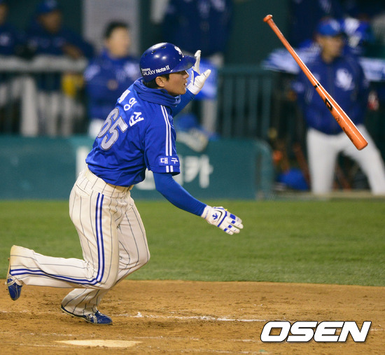 1일 오후 서울 잠실구장에서 열린 '2012 팔도 프로야구' 삼성 라이온즈와 SK 와이번스의 한국시리즈 6차전, 4회초 2사 1,2루에서 삼성 배영섭이 1타점 적시 2루타를 날리고 타구를 바라보고 있다.