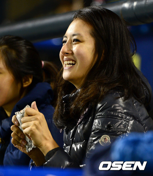 1일 오후 서울 잠실구장에서 열린 '2012 팔도 프로야구' 삼성 라이온즈와 SK 와이번스의 한국시리즈 6차전, 삼성 이승엽의 아내 모델 이송정이 관중석에서 경기를 바라보며 활짝 웃고 있다.
