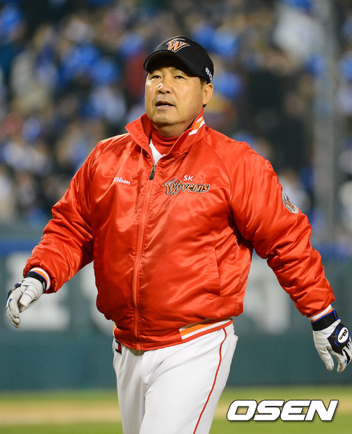 1일 오후 서울 잠실구장에서 열리는 '2012 팔도 프로야구' 삼성 라이온즈와 SK 와이번스의 한국시리즈 6차전 8회초 2사 주자 2루 마운드로 나가 SK 채병용 투수에서 최영필로 교체시킨 SK 이만수 감독이 덕아웃으로 들어오며 큰 숨을 내쉬고 있다.