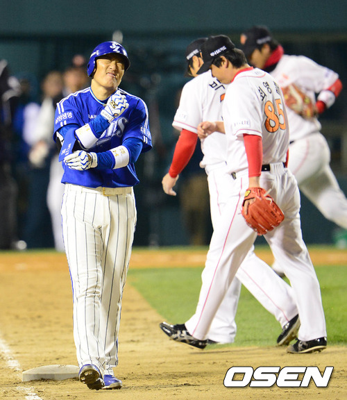 1일 오후 서울 잠실구장에서 열린 '2012 팔도 프로야구' 삼성 라이온즈와 SK 와이번스의 한국시리즈 6차전 경기 9회초 2사 이승엽이 내야땅볼로 물러나자 아쉬워하고 있다.
