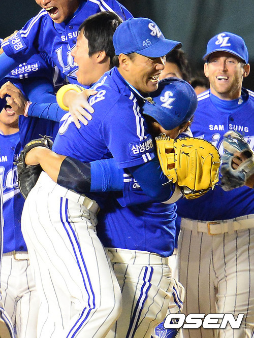 2012 최강은 또 다시 삼성이었다. 삼성이 중립지대 잠실벌에서 2연승을 거두고 2년 연속 한국시리즈 우승컵을 들어올렸다. 삼성은 1일 잠실구장에서 열린 2012 팔도프로야구 SK와의 한국시리즈 6차전에서 선발 장원삼의 완벽한 투구와 박석민의 투런홈런, 이승엽의 3타점 3루타를 적시에 폭발시켜 7-0으로 완승을 거두었다. 이로써 삼성은 시리즈 최종성적 4승2패를 거두고 작년에 이어 2년 연속 완전우승을 차지했다. 경기 종료 후 이승엽과 박석민이 포옹을 나누고 있다. / baik@osen.co.kr