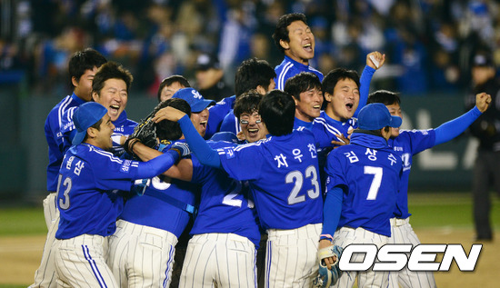 삼성 선수들이 우승이 확정되자 얼싸 안고 기뻐하고 있다./jpnews@osen.co.kr