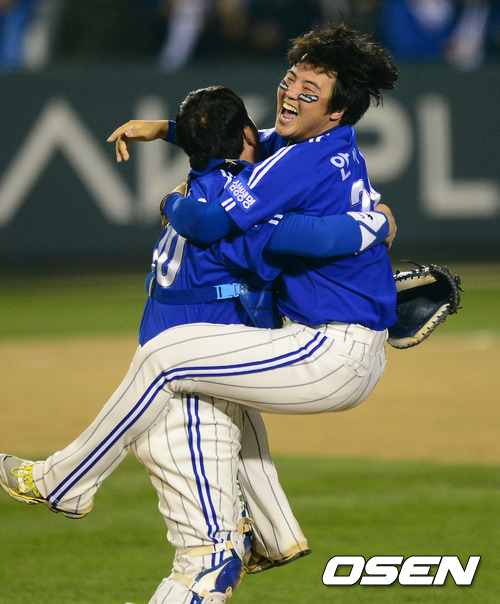 삼성 진갑용과 안지만이 우승이 확정되자 얼싸 안고 기뻐하고 있다./jpnews@osen.co.kr