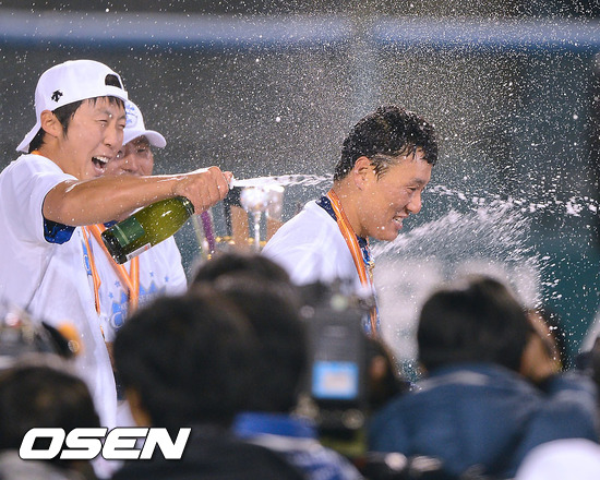 우승 후 한국시리즈 MVP로 선정된 이승엽이 동료들의 샴페인 세례를 받고 있다./ soul1014@osen.co.kr